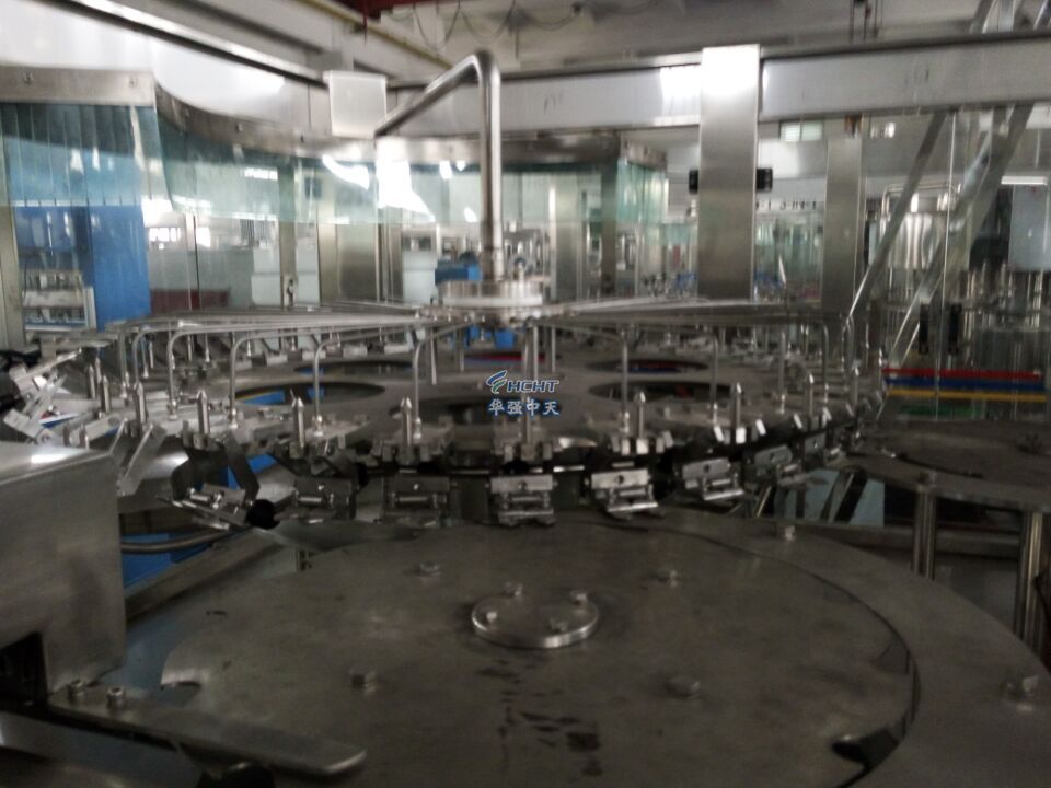 瓶子進入主機后通過傳輸星輪進入沖瓶機,瓶夾夾住瓶口沿沖瓶導軌向上翻轉180°,使瓶口向下。在沖瓶機特定區域(由分水盤決定——沖瓶水由沖瓶水泵泵入分水盤,后由分水盤通過24根管路分配至沖瓶夾),沖瓶夾噴嘴噴出無菌水,對瓶子內壁進行沖洗。瓶子經沖洗、瀝干后在瓶夾夾持下沿導軌向下再翻轉180°,使瓶口向上。洗凈后的瓶子通過過渡鋼撥輪(純水沖瓶)從沖瓶機導出并傳送至下一工序-灌裝。